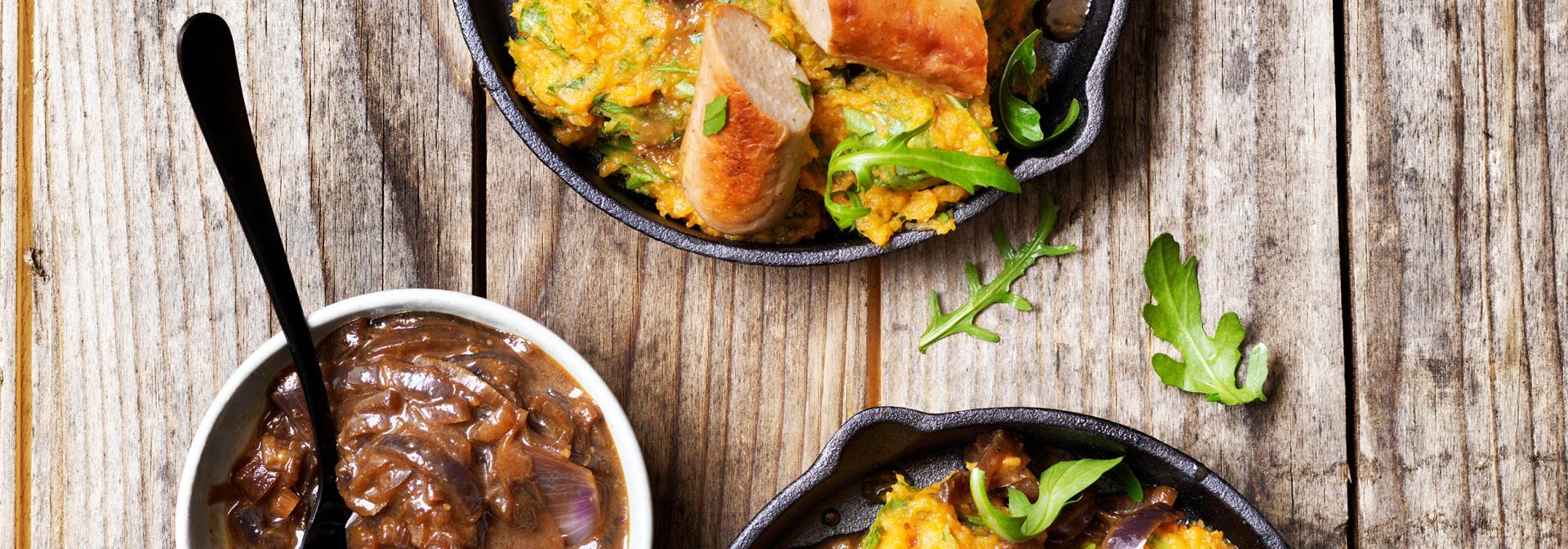 This flavorful vegan dish made of Garden Gourmet Sensational Sausage, sweet potatoes, rocket salad and onion-mustard gravy will make everyone happy with the combination of savory and sweet!