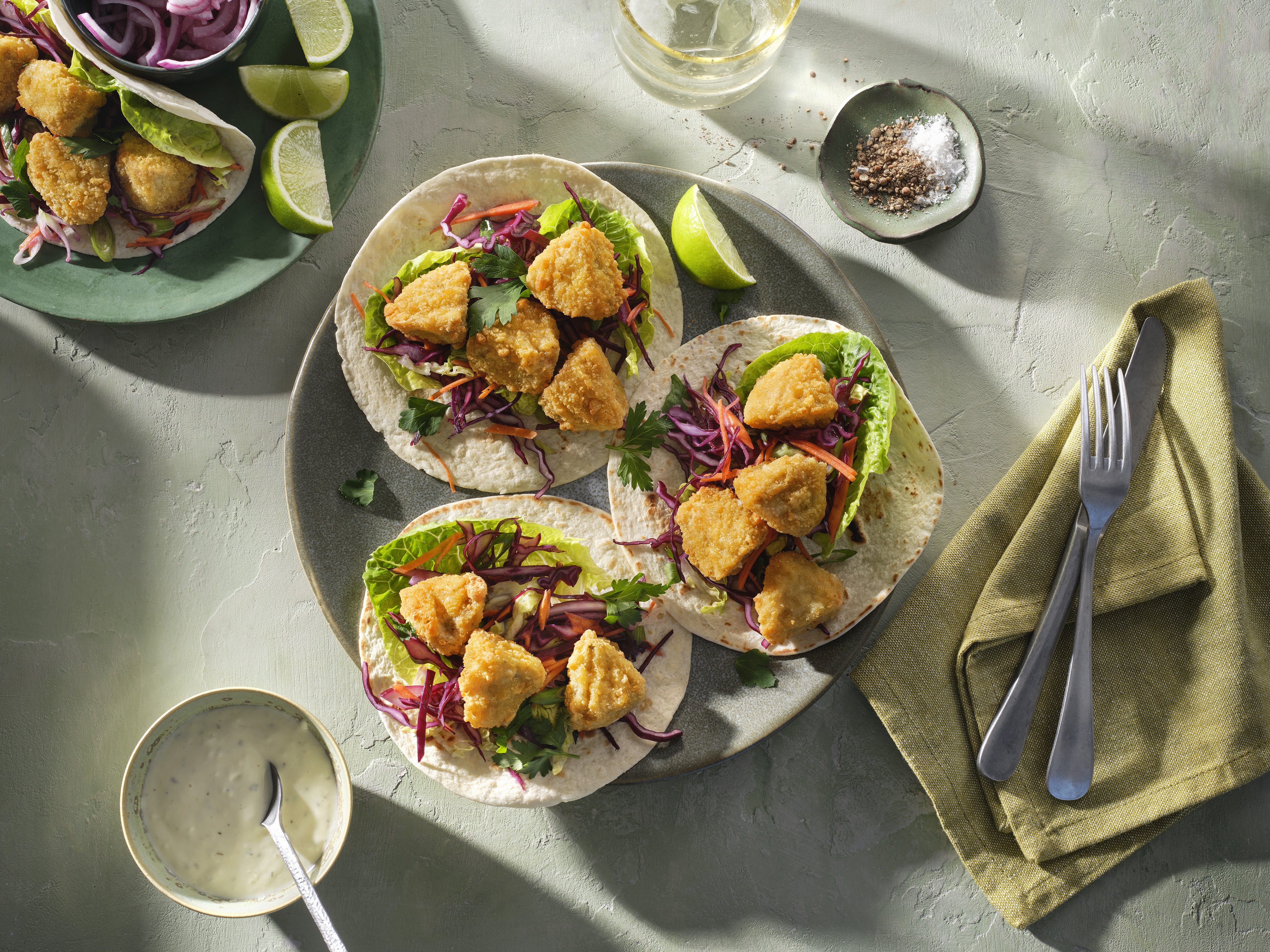 Fry the tortillas briefly on both sides in a hot frying pan. Divide romaine salad leaves and the cabbage salad on the tortillas and ‘Cheesy Nuggets’ on top. Serve with the yogurt sauce.