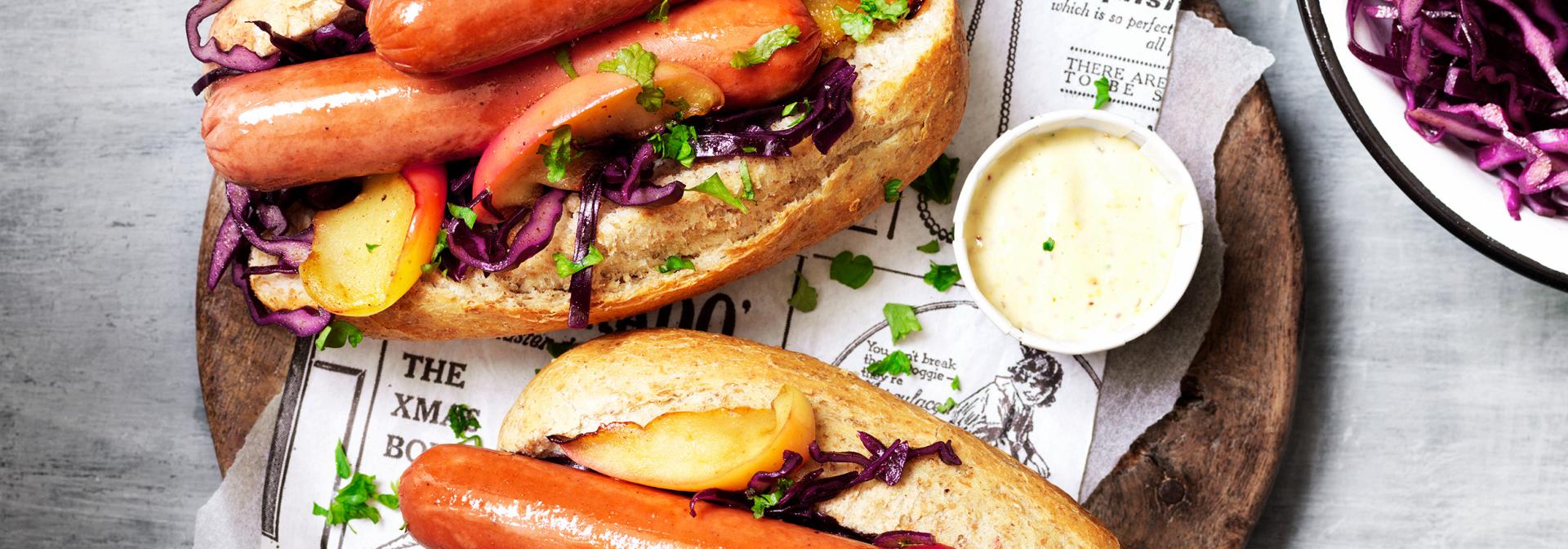 A gourmet version of the traditional hot dog! Discover our vegetarian hot dog recipe with Garden Gourmet Frankfurters, red cabbage and apple.